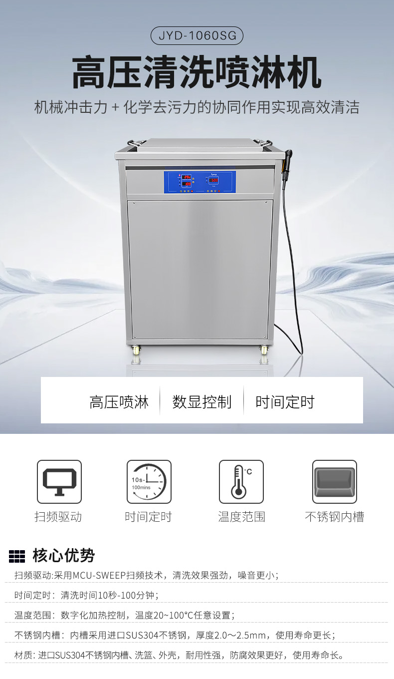 超声波高压清洗喷淋机JYD-1060SG采用MCU-SWEEP超声波发生器驱动技术,在实现强劲清洗效果的同时,有效降低运行噪音。