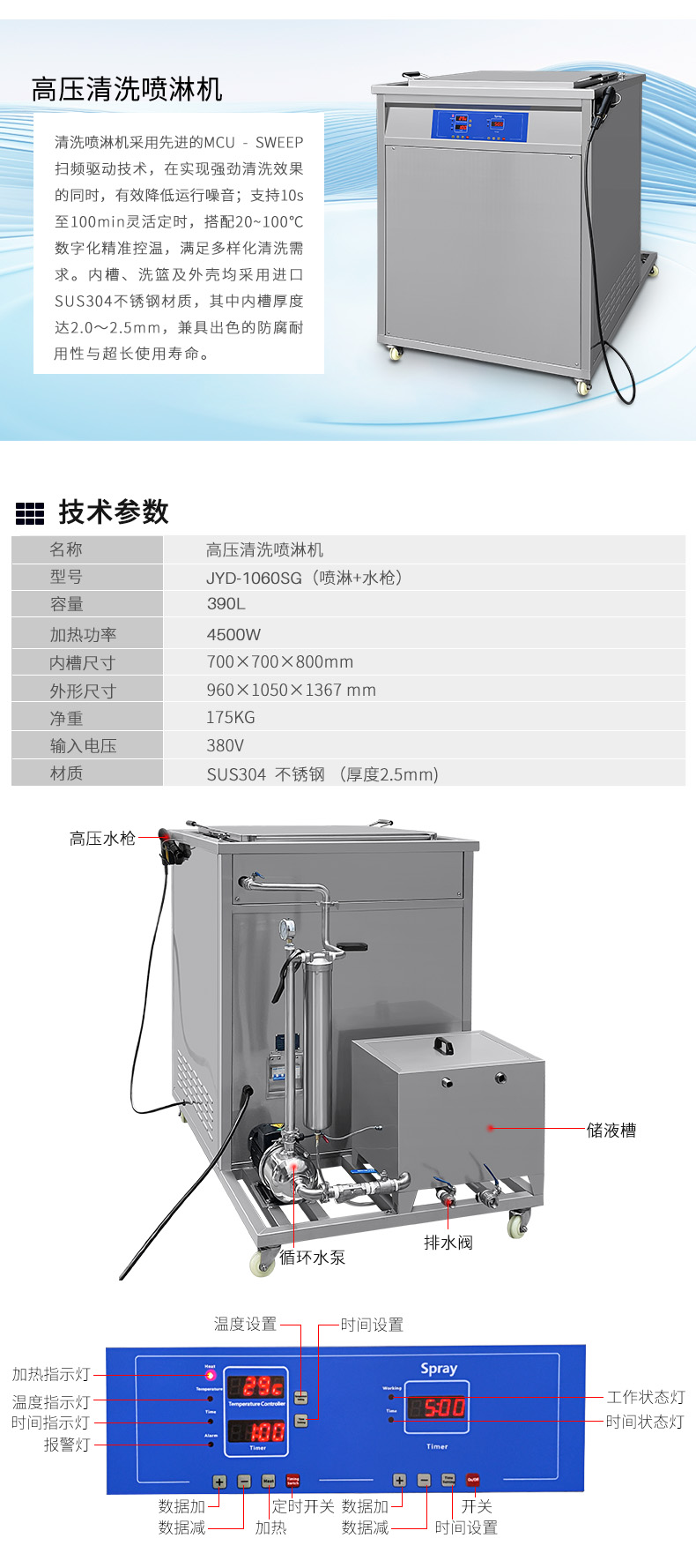390L 4500W 超声波高压清洗喷淋机JYD-1060SG