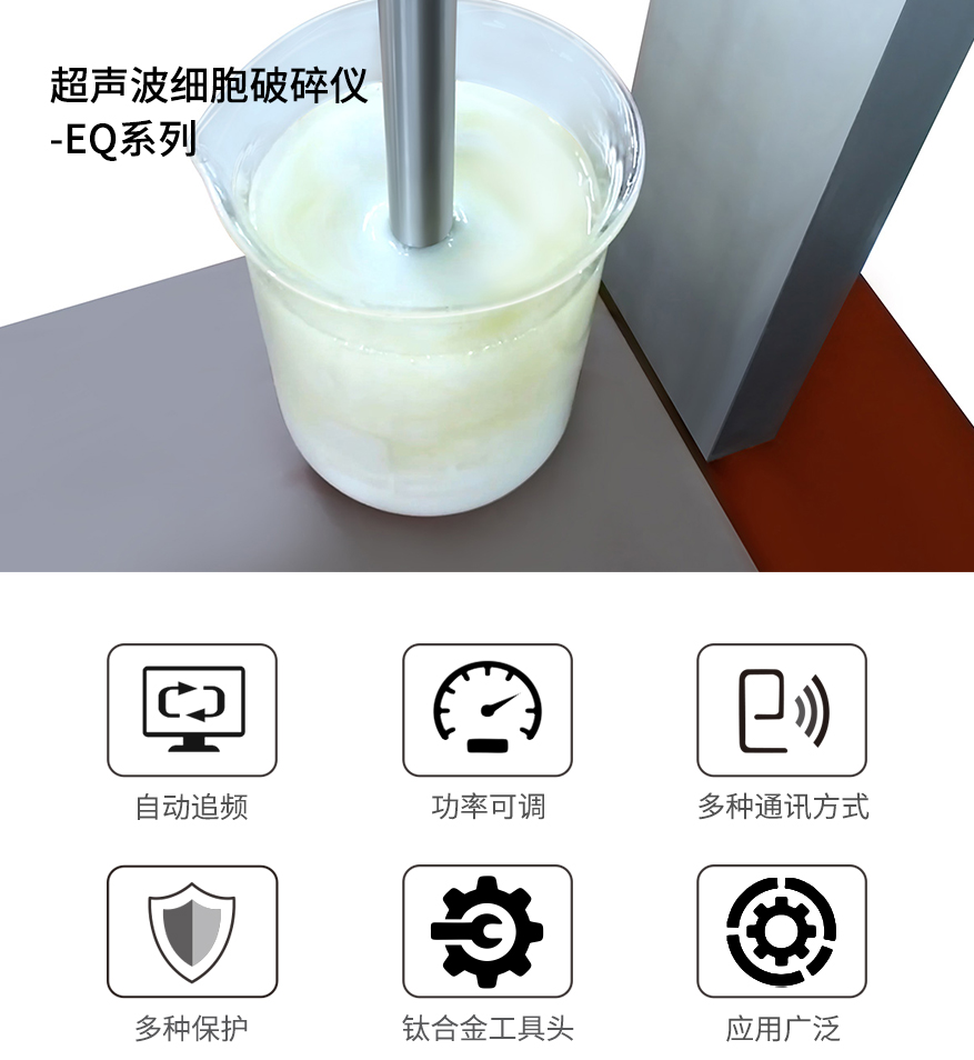在微观探索的神秘领域,EQ300系列超声波实验室设备宛如隐匿的超级引擎。900W澎湃超声功率,搭配28KHz精妙频率,专为中小实验室样品的超声处理定制。每一次运作,都是精准与高效的激昂碰撞,以无声的震撼,驱动科研突破的巨轮。EQ300超声波均质机是实验设备里一位具有强大能力的好帮手,纯数字化电路及控制恒功率输出,配合不同的超声波工具头轻松驾奴,从1mL-2000mL样品处理,触摸控制,二十组工艺选择及自动保存,以使用户具有更多的灵活性。