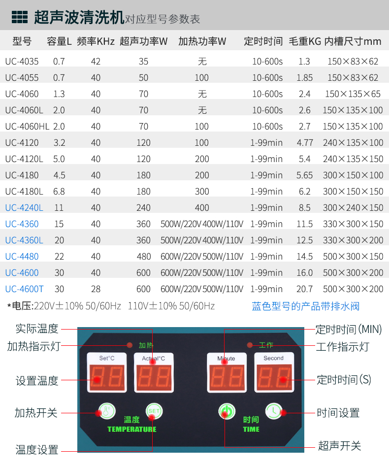 双频,多频,数码显示,时间温度可调 UC-3000系列超声波清洗机...