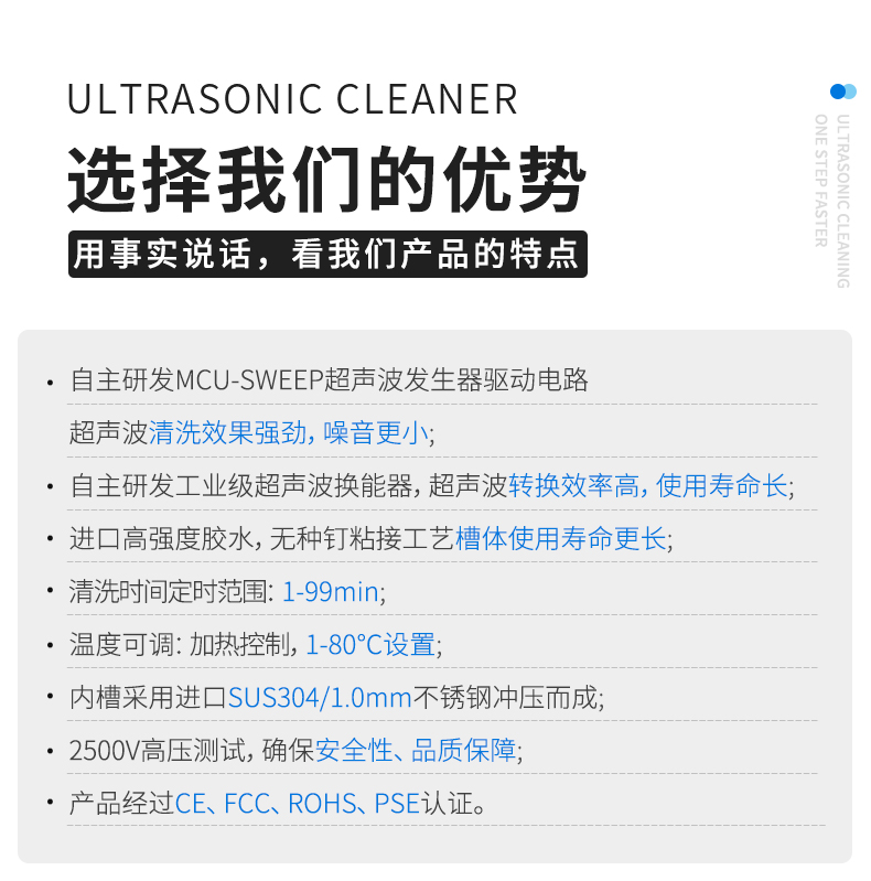 单频超声波清洗机UC-4000系列,自主研发的MCU-SWEEP超声波发生器驱动电路,超声波效果均匀强劲,噪音更小。高Q值工业级换能器,转换效率更高,使用寿命更长。