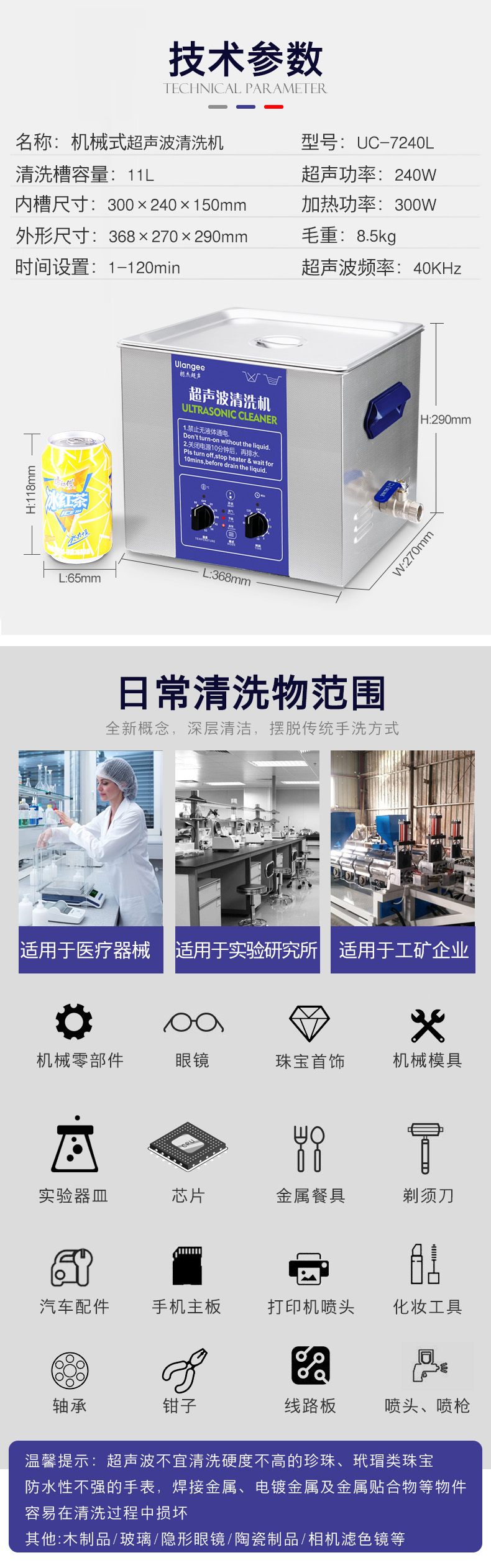 医疗器械:超声波清洗机在医疗行业应用也很广泛,经常被用于牙科诊所,手术器械,内腔镜等器械的清洗,医用器械对清洁度要求较高,表面残留的细菌病毒需要彻底清楚杀菌,确保医用产品的安全性与卫生。