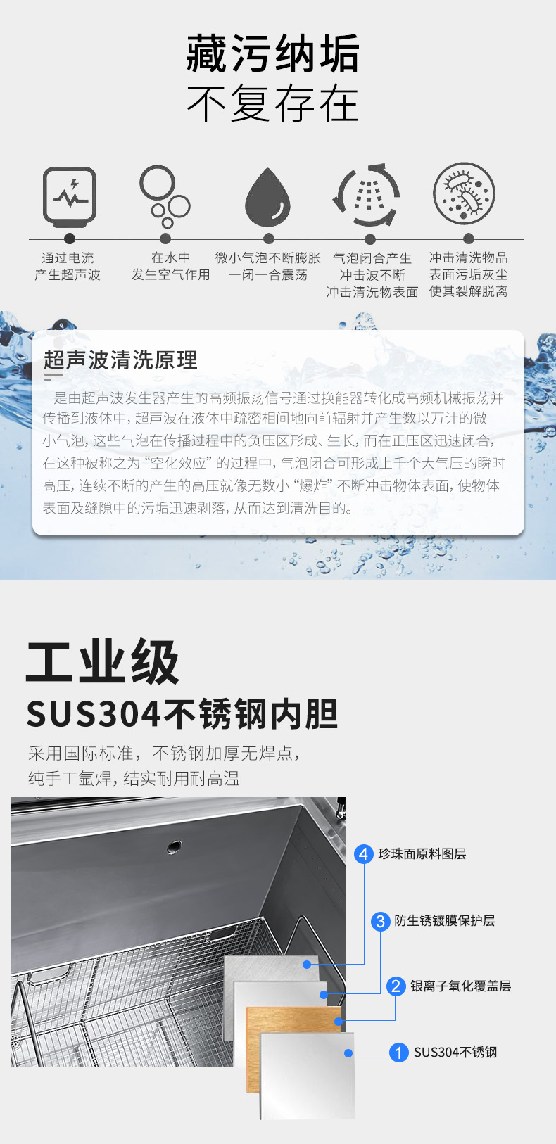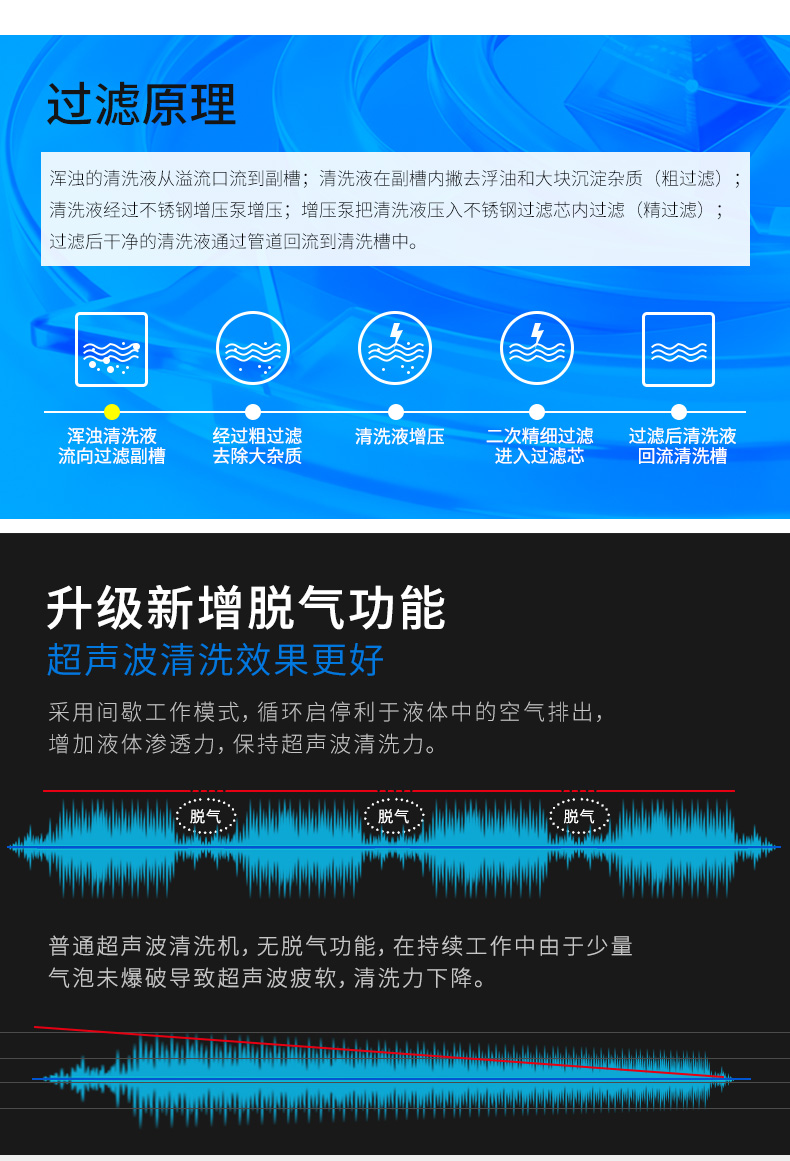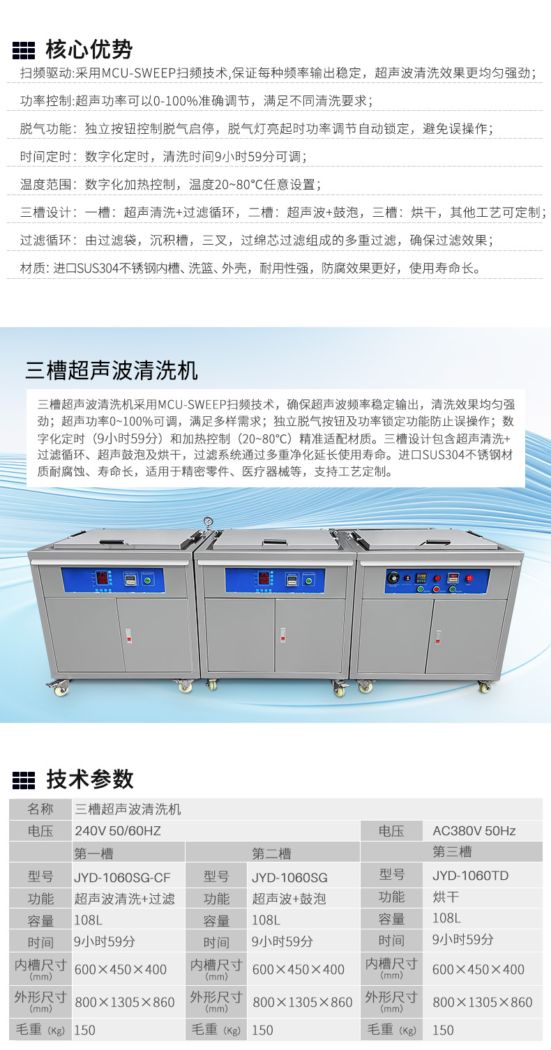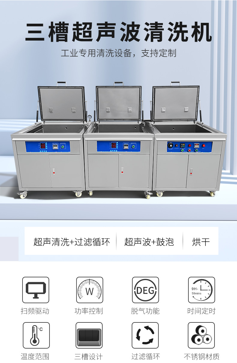 三槽超声波清洗机采用MCU-SWEEP扫频技术,确保超声波频率温度输出,清洗效果均匀强劲,超声功率0-100%可调,满足多样要求。